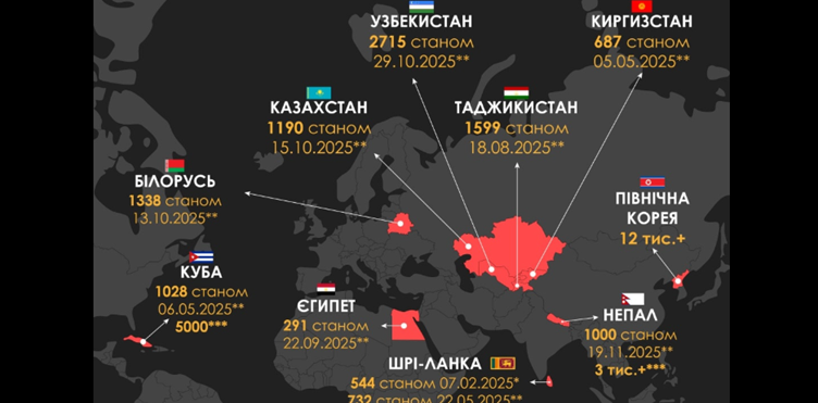 Entre los países más afectados destacan Corea del Norte (12.000), Uzbekistán, Tayikistán, Kazajistán y Bielorrusia. En esa lista de los diez primeros aparece Cuba, con 1.028 cubanos reclutados oficialmente, aunque estimaciones más altas hablan de miles más.